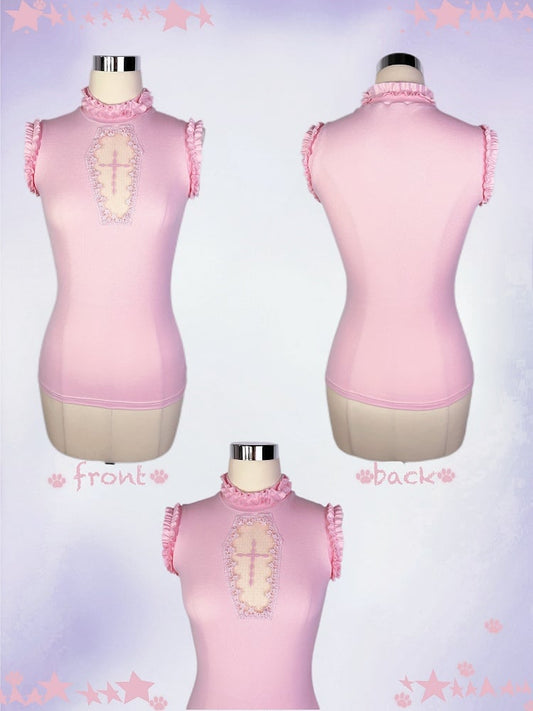 Goth Pink Mock Neck Coffin-Shaped Cutout Pastel Light Sleeveless Top