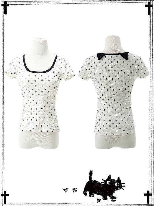 Detail Back Cat Paw Print Cat Ears and T-Shirt White at Allover Black Cross Pastel Gothic