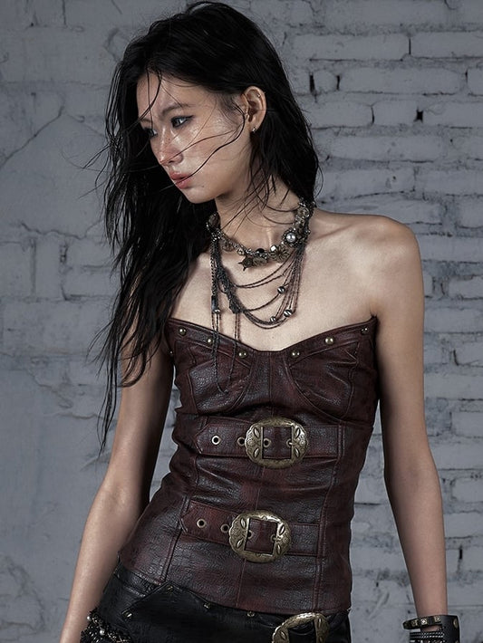 Bustier Buckle Decorated Punk Top Red/Brown Wasteland PU
