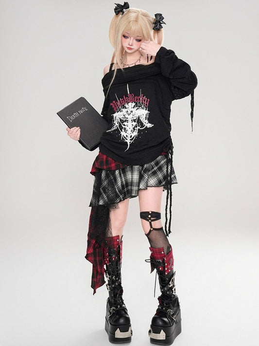 Y2K Black/White Cross Print Cutout Detail Off-the-shoulder Neckline Punk Top