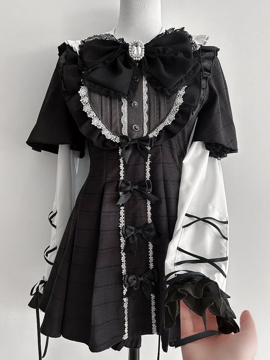 Detachable Dress + Sleeves Gray Tie Set Short-Sleeve Shorts Kei Matching Dark Jirai Full Bow