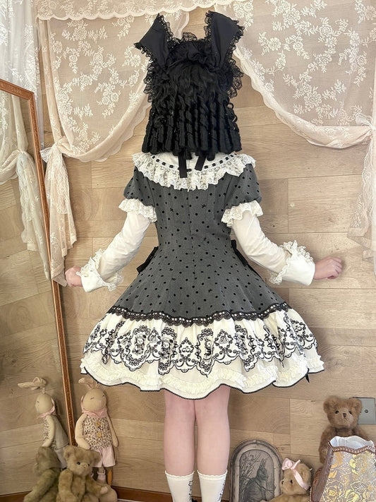 Sweet Rabbit Gray Polka Dot Pattern Sweetheart Lolita Detachable Dress Bonnet + with Sleeves Set Appliques