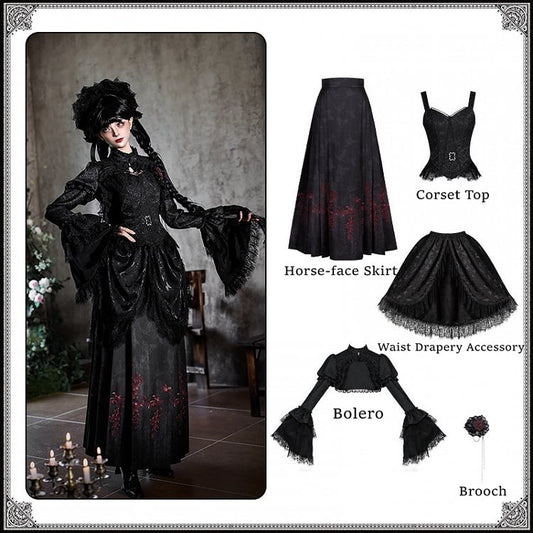 Lolita Drapery Bolero Top Waist + Black Corset Drawstring Brooch Gothic Long Skirt