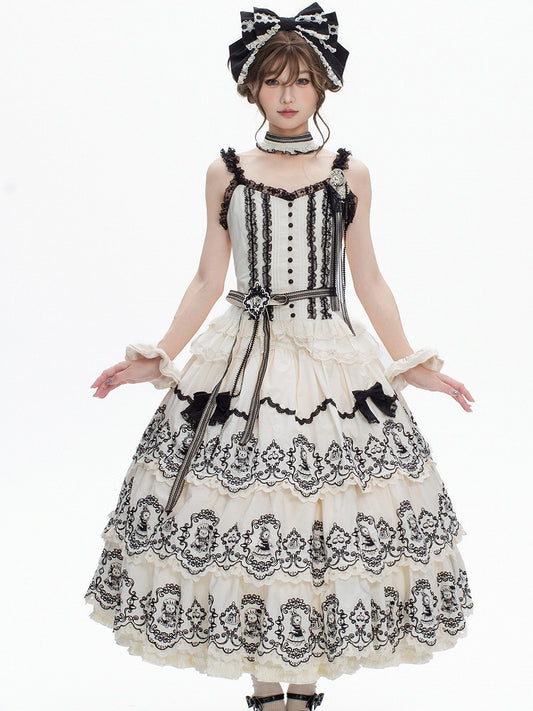 Wrist Full Painting-Inspired Apricot Lolita Skirt + Set Short Elegant Embroidered Cuffs Hanayome JSK - Oil Extension Large Floral Dress White Bow Brooch