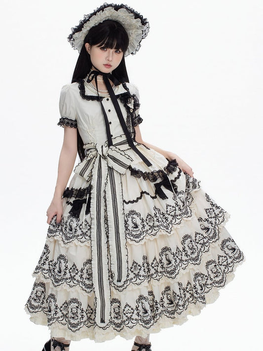 White Blouse Trim Black Lolita Pattern Scalloped Edge with Skirt Puff + Elegant Layered Rabbit Sleeves Set