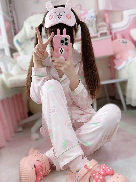 Set Strawberry Cat Light Pajama - Paw Print Pink