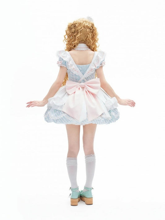 OP Stripe Full Train Bow Lolita Dress Brooch + Detachable Apron Bubble Decor Cake Puppy Skirt Blue Cute Set Sleeves with Hairband