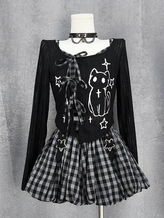 Y2K Coverup Set Plaid Cami Top with Kitten Print Black Red/Gray