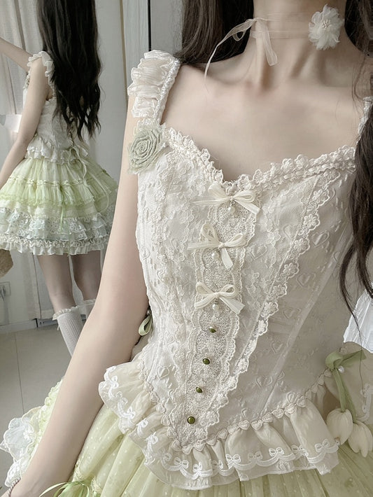 Jacquard Corset Heart Sleeves Fabric Top Flutter Tiered Ivory
