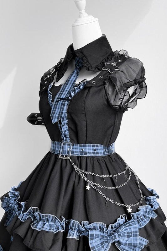 Embellished Mini Dress+Shorts Heart Waist Flutter Jirai Kei Black White Plaid High Sleeves Set