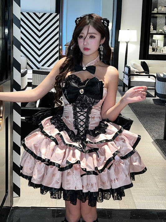Pink Bowknot Fabric Tiered Puffy Skirt Halter Neck Birthday Corset Dress