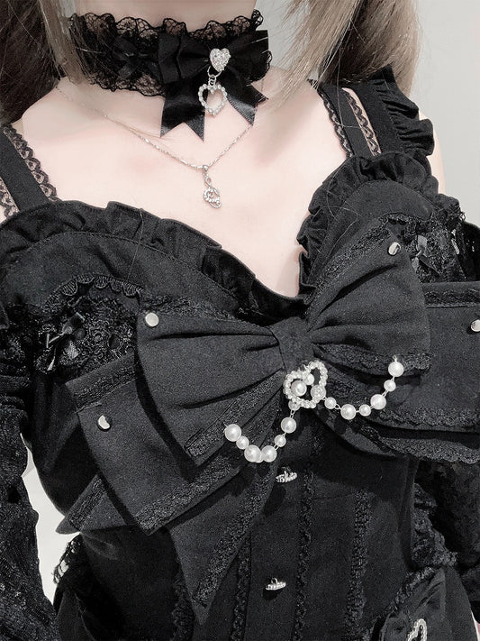 Dress Set Choker Jirai Cutout Bow Bowtie Bead Lace Chain Shorts Shoulder + Long-Sleeve Black Kei