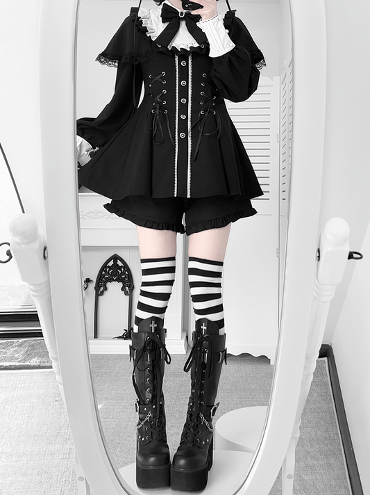 Matching + Bow Shorts Set Design Striped Dress Kei Cape Tie Jirai Black Long-Sleeve Lace-Up