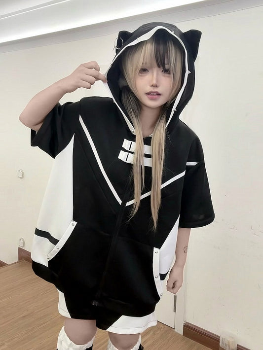 Black Jirai Kei Techwear Coord Set: Kitten Ear Hoodie with Detachable Sleeves, Utility Snaps, Shorts & Leg Warmers