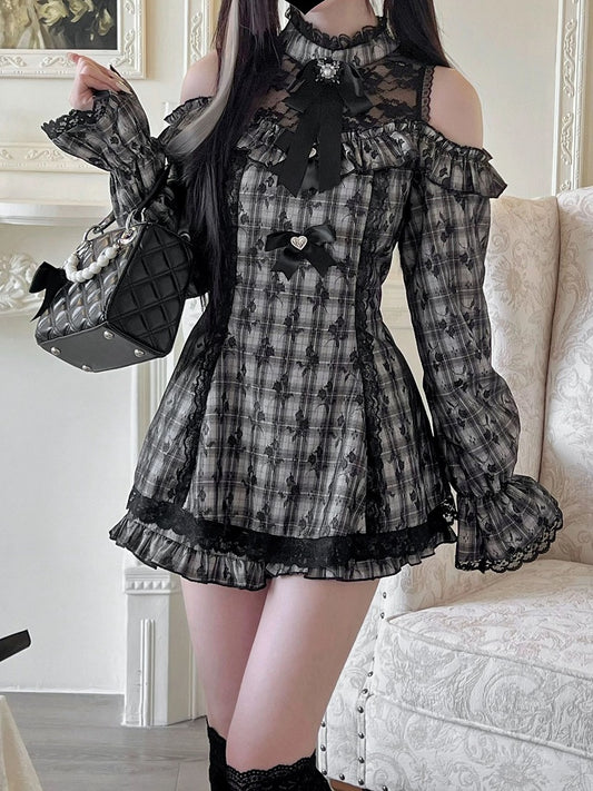 Set Skirt Cutout Shoulder Mini Shorts Jirai Kei Illusion Dress Neckline Plaid with Ruffled Gray Hem