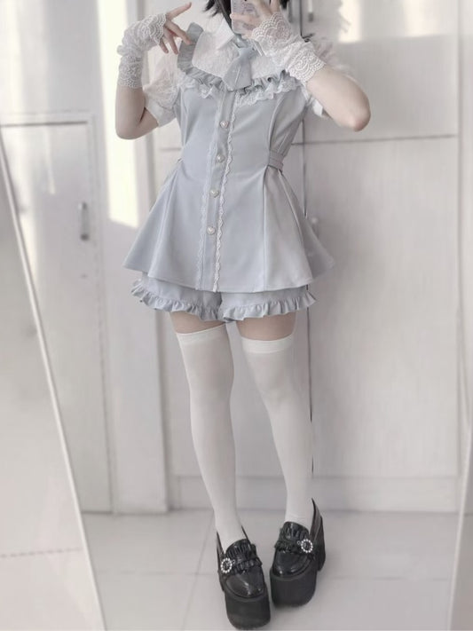 Buttons Hem Shorts+Tie Full Trim Light Kei Jirai Set-Lace Blue Blouse+Ruffled Heart