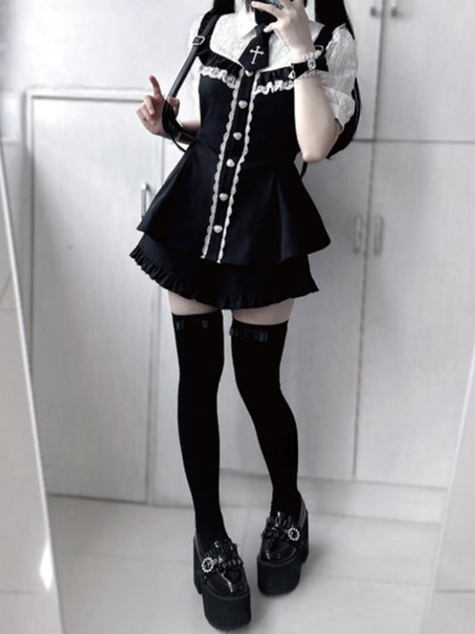 Mini Black Skirt with Jirai Kei Illusion Ruffled Shorts Cutout Shoulder Dress Hem Neckline Set
