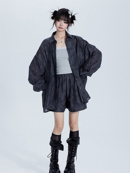 Shirt Set: Waist Top Polo Gray Shorts with Collar Tencel Elastic