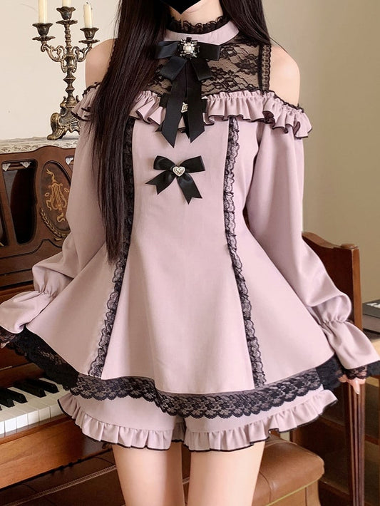 Jirai Full Set-Lace Hem Blouse+Ruffled Buttons Kei Heart Trim Black Shorts+Tie