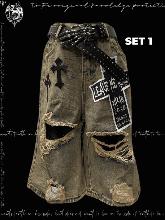 Punk Wasteland Cross Appliques Yellow Distressed Holes Denim Shorts Y2K