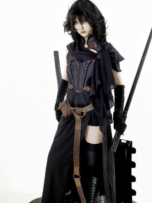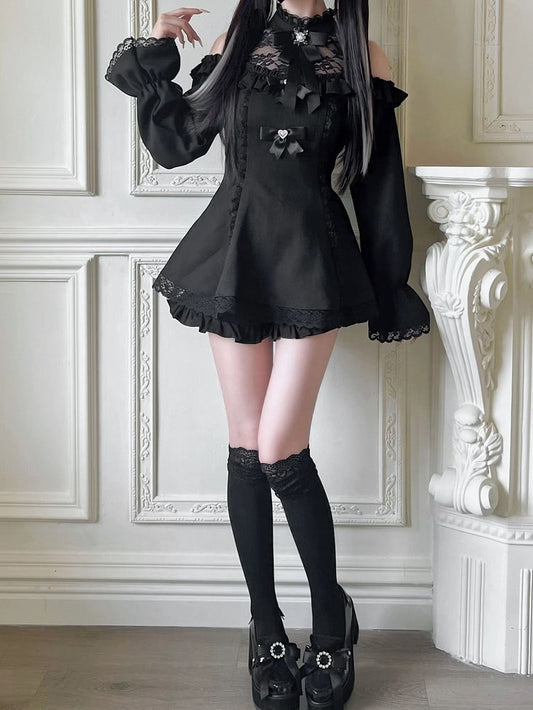Mini Black Skirt with Jirai Kei Illusion Ruffled Shorts Cutout Shoulder Dress Hem Neckline Set
