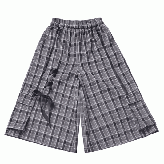 Wide-Leg Shorts with Lace-up Detail Waist Black/Plaid Elastic
