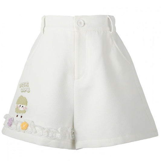 Floral Lace Trim White Shorts Lamb Embroidery Accents