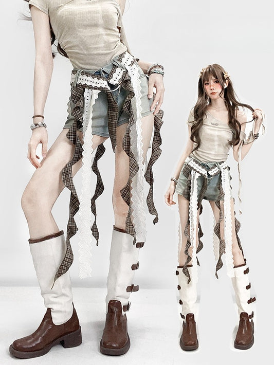 Lace-up Details with Red Leg Black Warmers and Butterfly Hem Denim Shorts Applique