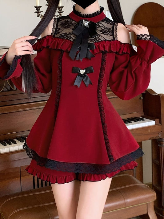 Hem Jirai Kei Black Set Shorts with Mini Neckline Cutout Shoulder Illusion Skirt Dress Red Ruffled