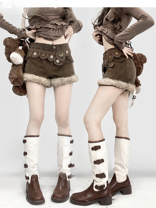 Y2K Vintage Brown Corduroy Plush Trim Wide-leg Shorts