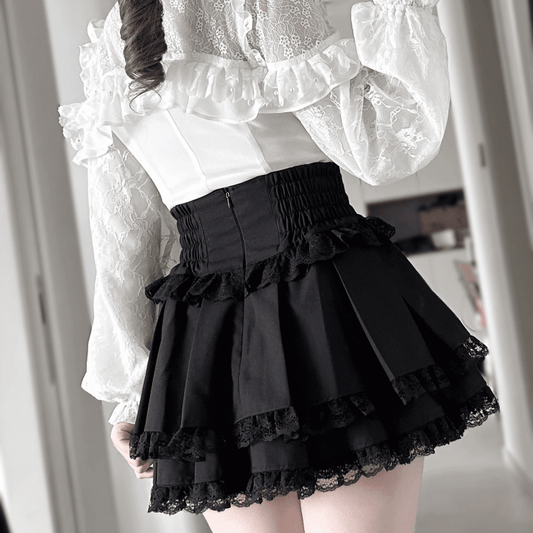 Tiered Design Detail Skirt Jirai and Layered Kei Black Lace Bow Trim with