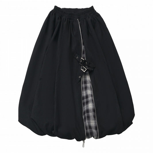 Strap Bubble Skirt Buckle Patchwork Design Plaid Mini Black with Zipper
