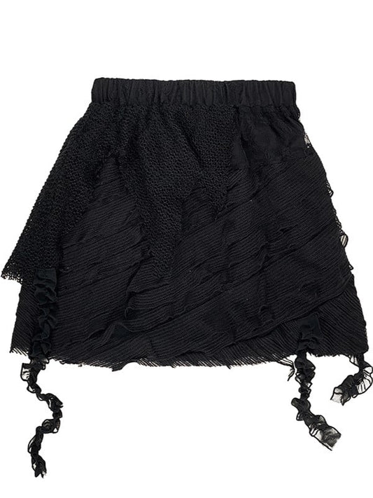 - Skirt Design with Jirai Kei Black Bow Tiered Cross Lace Tulle Edging