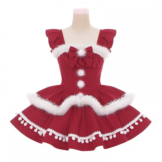 Christmas Red Princess Basque Waist Jumper Skirt with Festive White Plush Trim