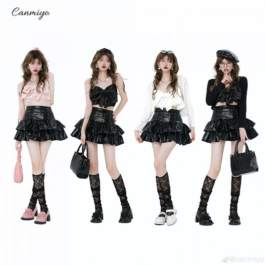 High Waist PU Leather Tiered Black Skirt
