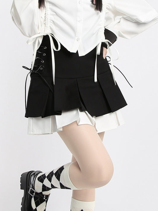 Pleated Skirt Style Double Heart Buckles Black Preppy