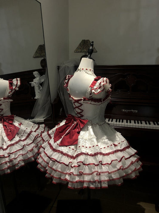 Ruffles Accents Skirt White Bow Jumper Tiered Princess Red Lolita