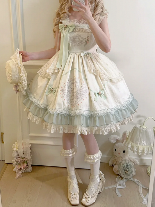 Butterfly Skirt Jumper Lolita Elegant Lace Layered Patches Creamy Dress