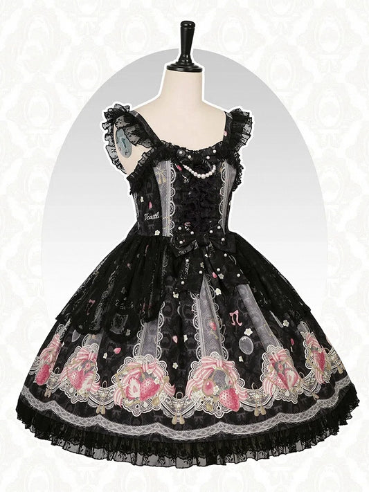Lolita Sweet Black Strawberry Jumper Print Skirt