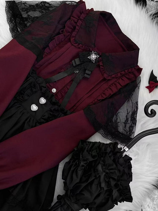 Jirai Collar Flat Red Details Blouse +Tiered Skirt Set-Pointed Kei Pleating