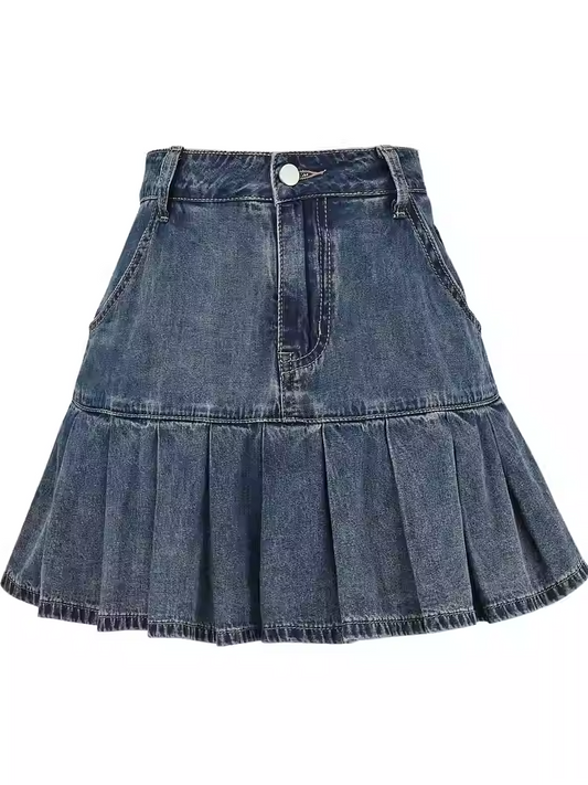 Waist Pleated Denim Skirt Blue High
