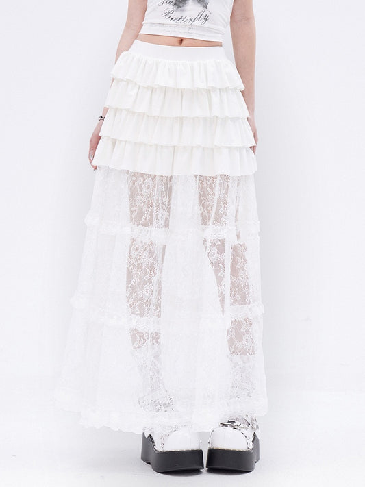 Long White Lace Skirt Hem Ruffle Tiered