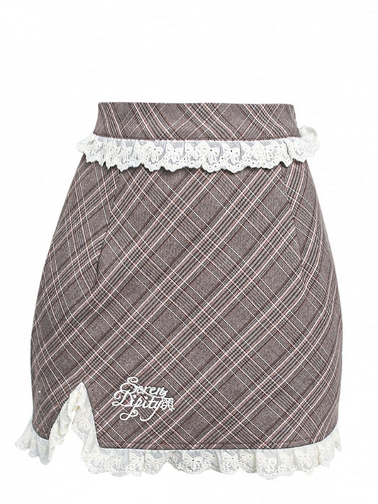 Bodycon Skirt Trim Lace Plaid Brown with Accents