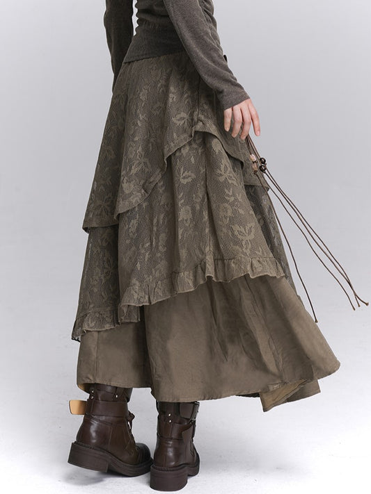 Lace Tiered Elastic Floral Waist Skirt Handkerchief Coffee Hem with