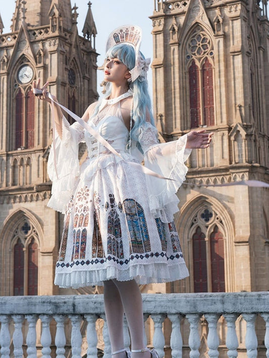 Window Halter White Gothic Lolita Neck Print Stained Jumper Church Skirt