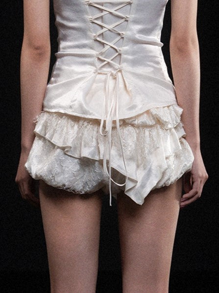 Waist Skirt Gothic Trim Puff Tiered Halloween Built-in Elastic Shorts Lace with Black