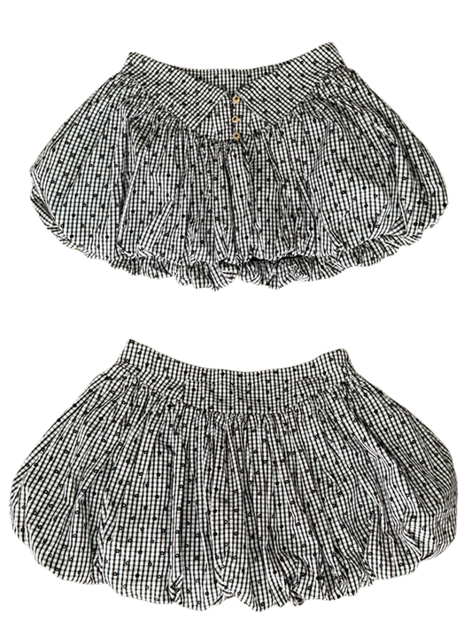 Skirt Floral Pattern with Plaid Bubble Waistband Collar Stand