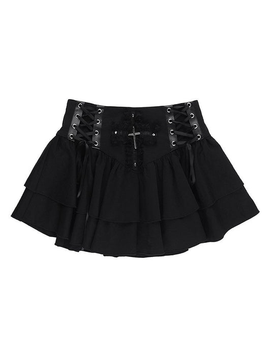 Crisscross Lacing Cross Halloween Gothic Metal Skirt Ruffle-trimmed with Tiered Black