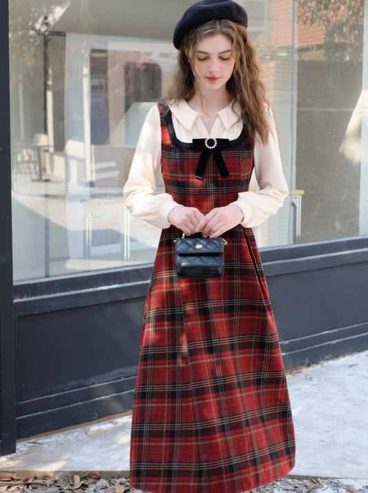 Collar Skirt Retro Suspender Green Check Ruffle Blouse Lace