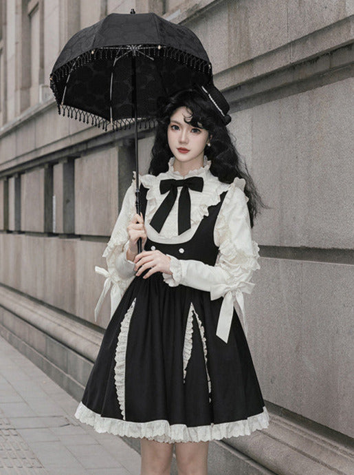 Strap Ribbon Ruffle + Stand Shirt Collar Ruffle Skirt